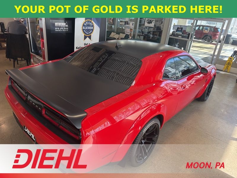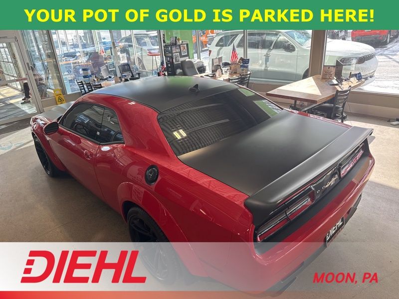 Under the hood lives a supercharged 6.2L HEMI V8 paired with an 8 speed automatic transmission, sending an absolutely wild amount of power to the rear wheels. This Widebody Challenger isn't shy about its intentions either. Massive performance tires, active suspension, Bilstein performance shocks, and four wheel disc brakes give this muscle car the grip and control needed to handle all that supercharged excitement. Finished in eye catching TorRed Clearcoat with painted black satin graphics, it looks every bit as aggressive as it feels.