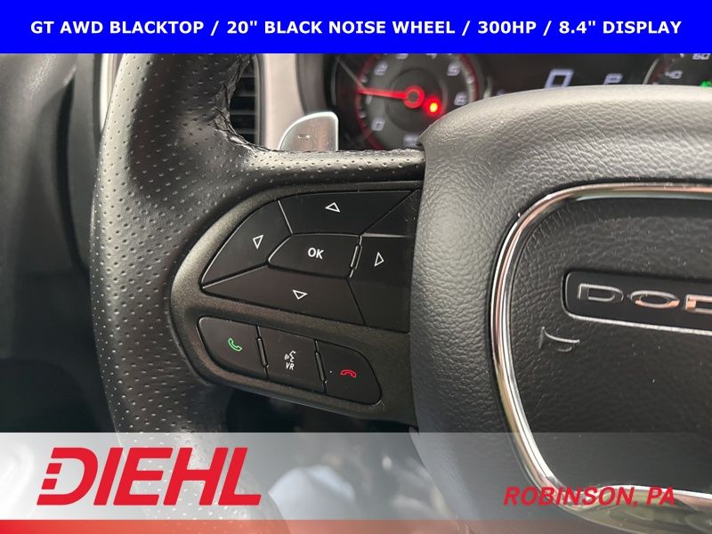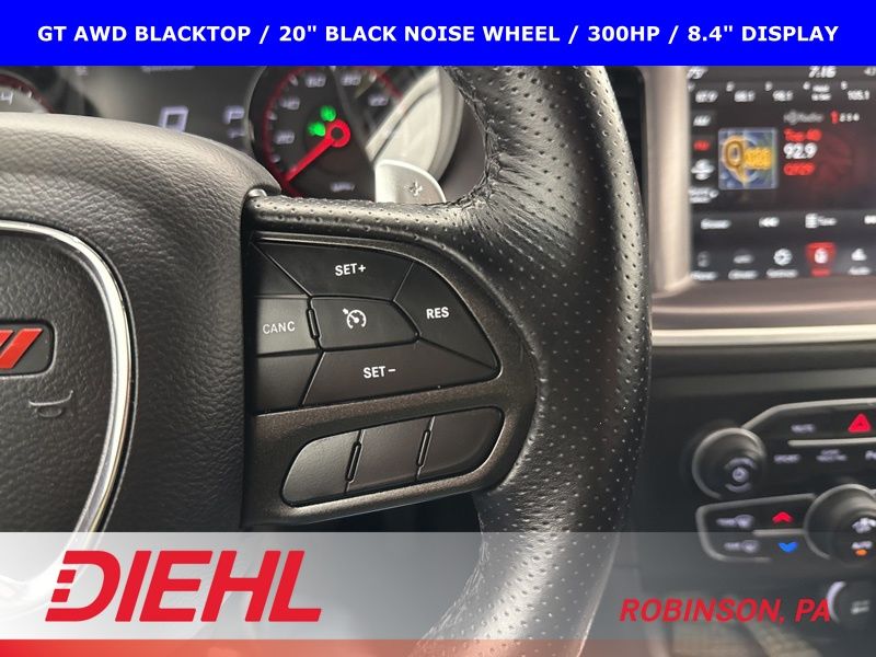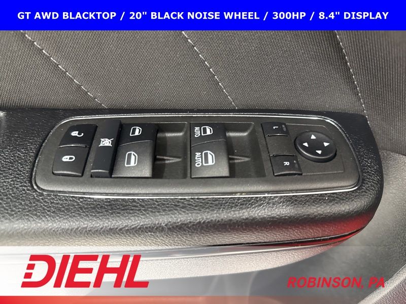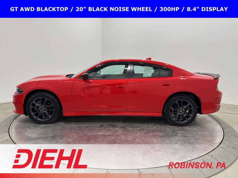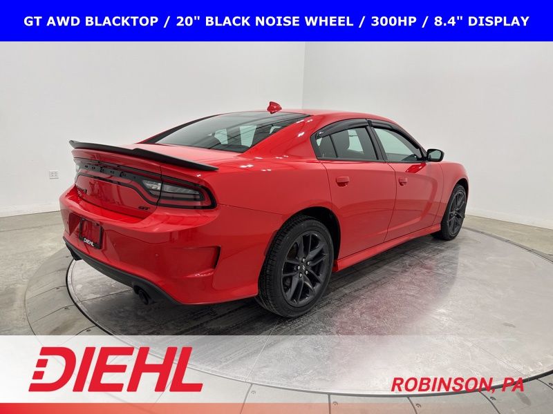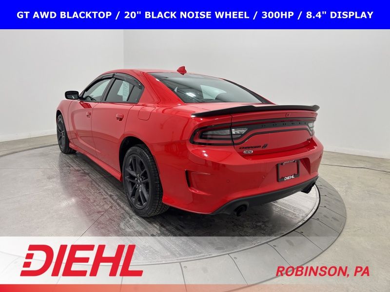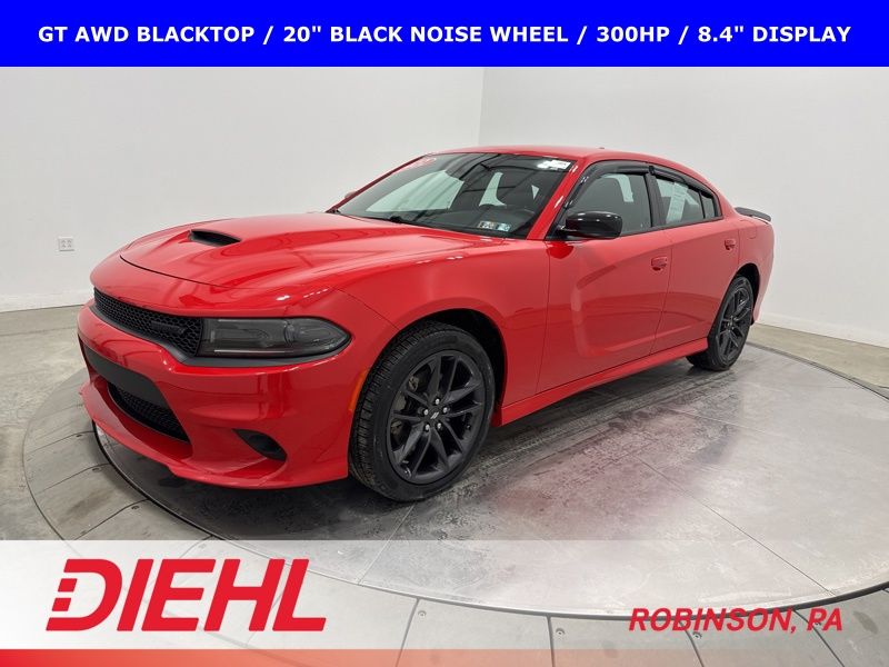 2022 Dodge Charger GT AWD Blacktop with 3.6L V6, 300 horsepower, 20 inch black wheels, remote start, and all wheel drive confidence.