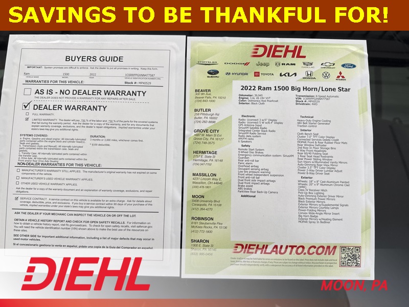 Bottom line: the 2022 Ram 1500 Big Horn Certified Gold delivers confidence, capability, and class in one irresistible package. Trucks like this don't stick around long come experience it today at Diehl of Moon and see why this Big Horn is the gold standard for certified pre-owned power.