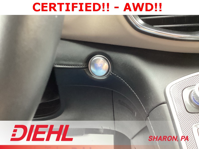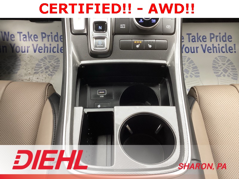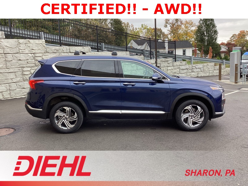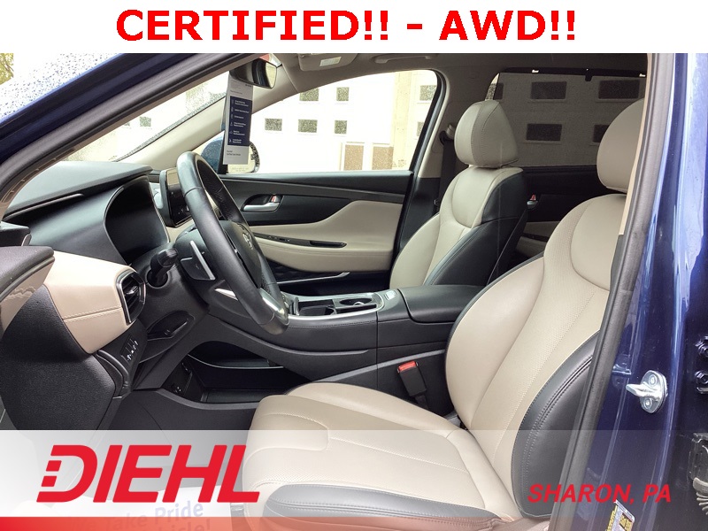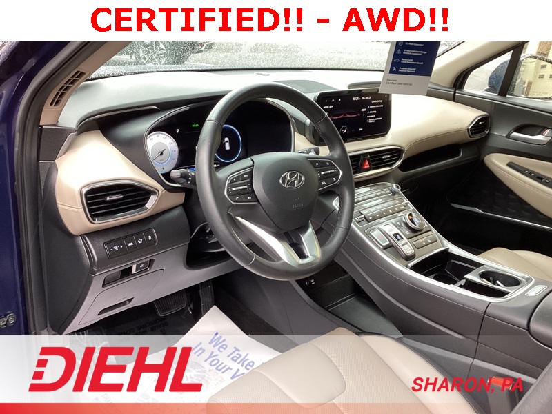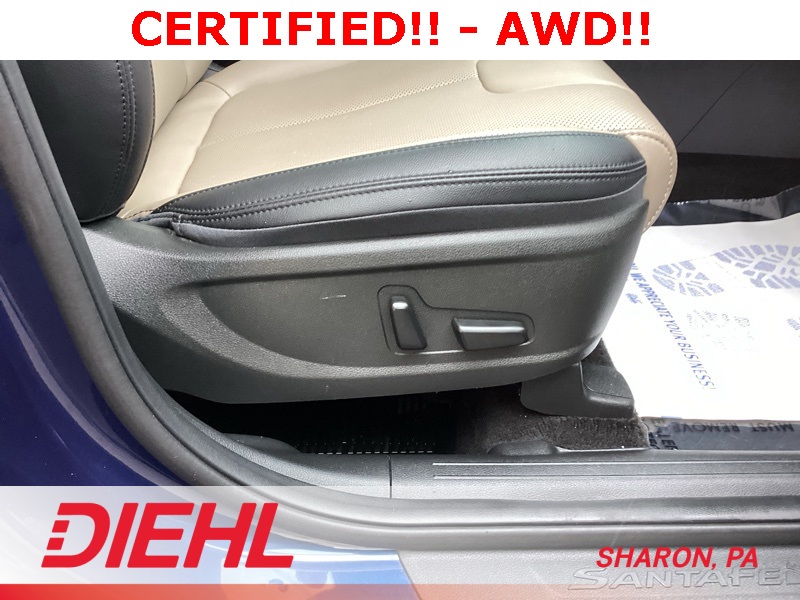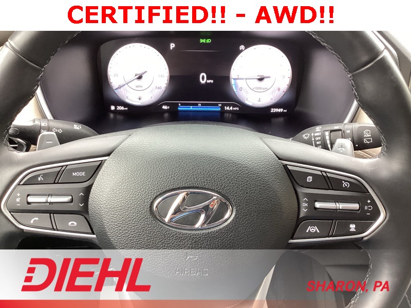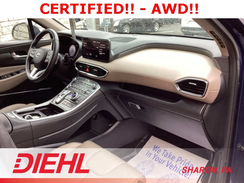 **APPLE CAR PLAY**, **ANDROID AUTO**, **CERTIFIED PRE OWNED**, AWD, Beige Artificial Leather, 12.3" LCD Multi-Information Display, 18" x 7.5J Alloy Wheels, 4-Wheel Disc Brakes, 6 Speakers, 8-Way Power Passenger Seat, ABS brakes, Acoustic-Laminated Front Side Windows, Air Conditioning, Alloy wheels, AM/FM radio: SiriusXM, Apple CarPlay & Android Auto, Auto High-beam Headlights, Auto-Dimming Rear-View Mirror, Automatic temperature control, Axle Ratio: 4.081, Blind-Spot View Monitor, Brake assist, Bumper Applique, Bumpers: body-color, Cargo Net, Carpeted Floor Mats, Chrome Front & Rear Bumper Accents, Chrome Interior Accents, Delay-off headlights, Driver door bin, Driver vanity mirror, Dual front impact airbags, Dual front side impact airbags, Electronic Stability Control, Emergency communication system, Exterior Parking Camera Rear, First Aid Kit, Four wheel independent suspension, Front anti-roll bar, Front Bucket Seats, Front Center Armrest, Front dual zone A/C, Front reading lights, Fully automatic headlights, H-Tex Leatherette Seat Trim, harman/kardon® Audio System, Heated door mirrors, Heated Front Bucket Seats, Heated front seats, Illuminated entry, Leather steering wheel, LED Interior Lights, LED Taillights, Low tire pressure warning, Manual Rear Side Sunshades, Navigation System, Occupant sensing airbag, Option Group 02, Outside temperature display, Overhead airbag, Overhead console, Panic alarm, Panoramic Sunroof, Passenger door bin, Passenger vanity mirror, Power door mirrors, Power driver seat, Power Liftgate, Power Release 2nd Row Seats, Power steering, Power windows, Premium Package, Radio: AM/FM Display Audio, Rear anti-roll bar, Rear seat center armrest, Rear window defroster, Rear window wiper, Remote keyless entry, Roof Rack Cross Bars (DISC), Security system, Silver Front Grille, Speed control, Speed-sensing steering, Split folding rear seat, Spoiler, Stain-Resistant Cloth Seat Trim, Steering wheel mounted audio controls, Surround View Monitor, Tachometer, Telescoping steering wheel, Tilt steering wheel, Traction control, Trip computer, Turn signal indicator mirrors, Variably intermittent wipers. Certified. Stormy Sea 2023 Hyundai Santa Fe SEL AWD 8-Speed Automatic with SHIFTRONIC 2.5L I4