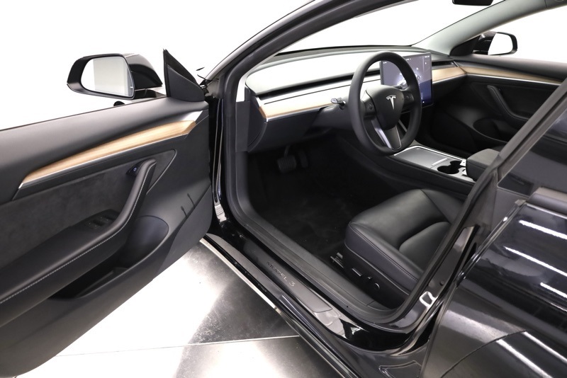 **BLUETOOTH HANDS FREE PHONE**, **LEATHER**, **BACK-UP CAMERA**, **LANE DEPARTURE WARNING**, **AUTO HIGH BEAMS**, **HEATED STEERING WHEEL**, **MEMORY DRIVER SEAT**, **HEATED FRONT SEATS**, **FULLY AUTO HIGH BEAMS**, 4-Wheel Disc Brakes, 8 Speakers, ABS brakes, Air Conditioning, Alloy wheels, Audio memory, Auto High-beam Headlights, Auto-dimming door mirrors, Auto-dimming Rear-View mirror, Automatic temperature control, Brake assist, Bumpers: body-color, Compass, Delay-off headlights, Driver door bin, Driver vanity mirror, Dual front impact airbags, Dual front side impact airbags, Electronic Stability Control, Emergency communication system, Exterior Parking Camera Rear, Four wheel independent suspension, Front anti-roll bar, Front Bucket Seats, Front Center Armrest, Front dual zone A/C, Front reading lights, Fully automatic headlights, Genuine wood dashboard insert, Heated door mirrors, Heated Front Bucket Seats, Heated front seats, Heated rear seats, Heated steering wheel, HVAC memory, Illuminated entry, Knee airbag, Lane Departure Warning System, Low tire pressure warning, Memory seat, Navigation System, Occupant sensing airbag, Outside temperature display, Overhead airbag, Passenger door bin, Passenger vanity mirror, Power door mirrors, Power driver seat, Power passenger seat, Power steering, Power windows, Premium Seat Trim, Radio data system, Radio: Upgraded Audio System, Rain sensing wipers, Rear reading lights, Rear seat center armrest, Rear window defroster, Security system, Speed control, Speed-sensing steering, Split folding rear seat, Steering wheel memory, Steering wheel mounted A/C controls, Steering wheel mounted audio controls, Telescoping steering wheel, Tilt steering wheel, Traction control, Trip computer, Variably intermittent wipers, Wheels: 18" x 8.5" Aero. Clean CARFAX. Solid Black 2023 Tesla Model 3 RWD 1-Speed Automatic Electric Motor