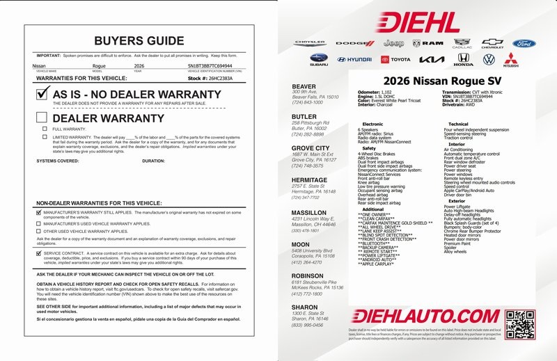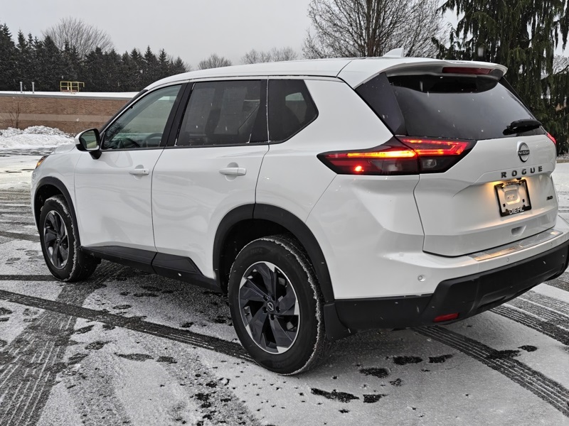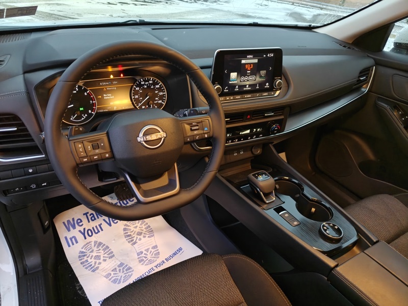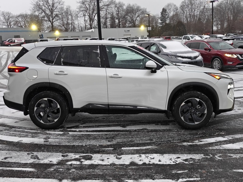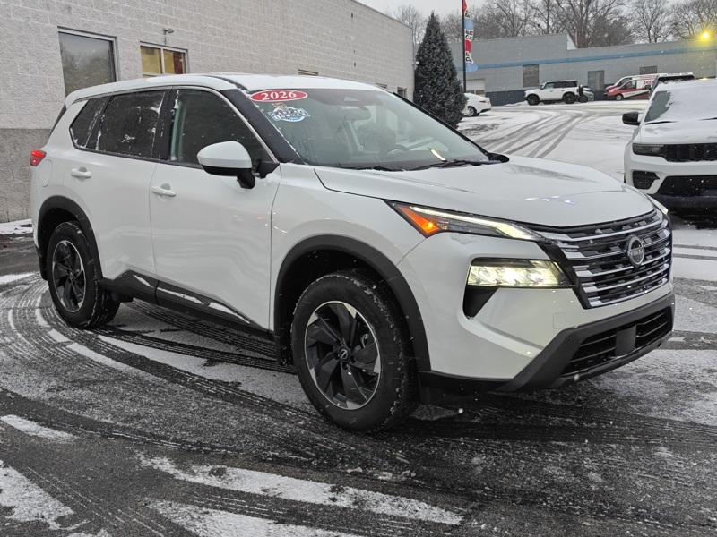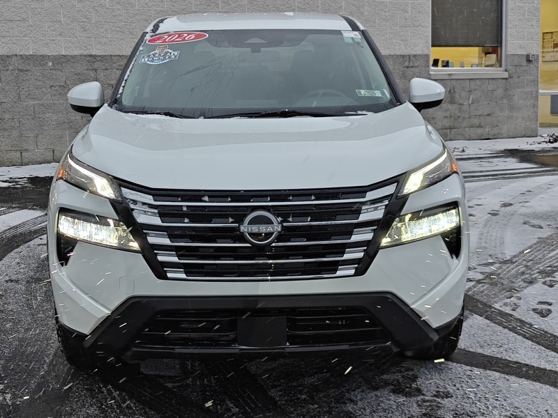 Everest White Pearl Tricoat 2026 Nissan Rogue SV 4D Sport Utility AWD 1.5L DOHC CVT with Xtronic Rogue SV, AWD, Everest White Pearl Tricoat, Charcoal Cloth, 4-Wheel Disc Brakes, 6 Speakers, ABS brakes, Air Conditioning, Alloy wheels, AM/FM radio: Sirius, Apple CarPlay/Android Auto, Auto High-beam Headlights, Automatic temperature control, Black Splash Guards (set of 4), Brake assist, Bumpers: body-color, Chrome Rear Bumper Protector, Cloth Seat Trim with Patterned Inserts, Delay-off headlights, Driver door bin, Driver vanity mirror, Dual front impact airbags, Dual front side impact airbags, Electronic Stability Control, Emergency communication system: NissanConnect Services, Floor Mats with 1-Piece Cargo Area Protector, Four wheel independent suspension, Front anti-roll bar, Front Bucket Seats, Front Center Armrest, Front dual zone A/C, Front reading lights, Fully automatic headlights, Heated door mirrors, Illuminated entry, Knee airbag, Low tire pressure warning, Occupant sensing airbag, Outside temperature display, Overhead airbag, Overhead console, Panic alarm, Passenger door bin, Passenger vanity mirror, Power door mirrors, Power driver seat, Power Liftgate, Power steering, Power windows, Premium Paint, Radio data system, Radio: AM/FM NissanConnect, Rear anti-roll bar, Rear seat center armrest, Rear side impact airbag, Rear window defroster, Rear window wiper, Remote keyless entry, Speed control, Speed-sensing steering, Speed-Sensitive Wipers, Split folding rear seat, Spoiler, Steering wheel mounted audio controls, Tachometer, Telescoping steering wheel, Tilt steering wheel, Traction control, Trip computer, Variably intermittent wipers, and Wheels: 18" Dark Painted Machine Finished Alloy. Odometer is 841 miles below market average! 28/35 City/Highway MPG